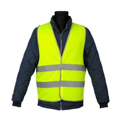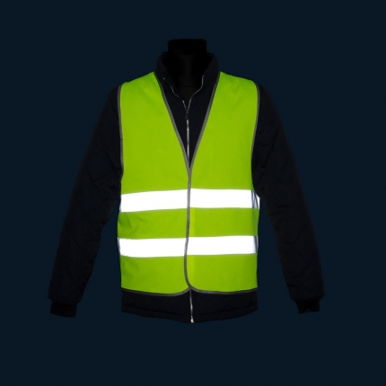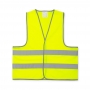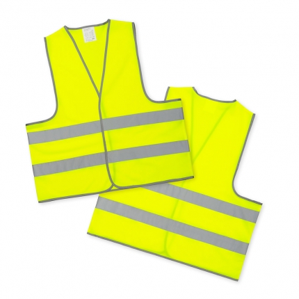 Kamizelka z dzianiny poliestrowej 100%. 2 pasy odblaskowe, zapięcie z przodu na rzep. Obszycie wzmocnioną szarą lamówką klasy Premium