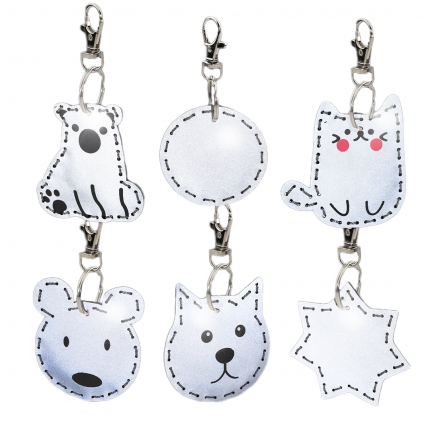 Maskotki odblaskowe 2D wykonane są z odblaskowego materiału i posiadają zapięcie umożliwiające przypięcie ich do torby lub plecaka. Doskonale odbijają światło reflektorów samochodowych, a jednocześnie służą jako ciekawe i atrakcyjne uzupełnienie dekoracji.