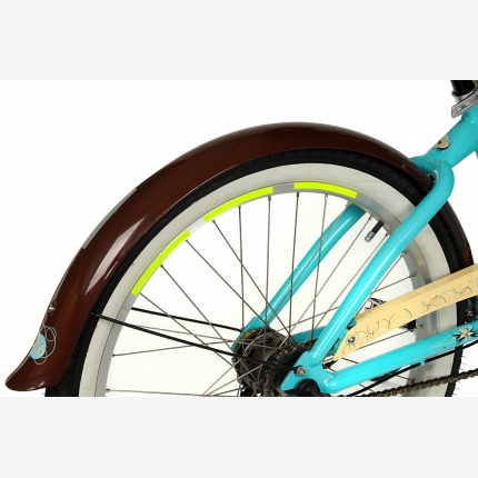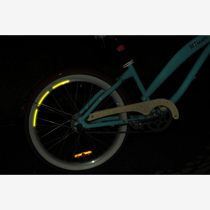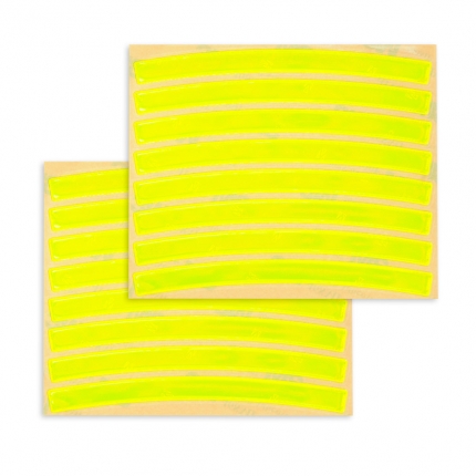 Zestaw składa się z dwóch arkuszy z naklejkami w kształcie wygiętych pasków - po jednym komplecie na każde koło rowerowe.